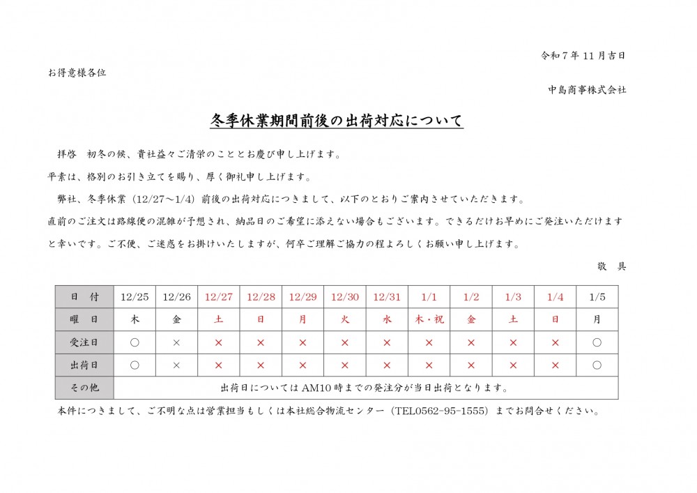 2025年冬季休業のお知らせ
